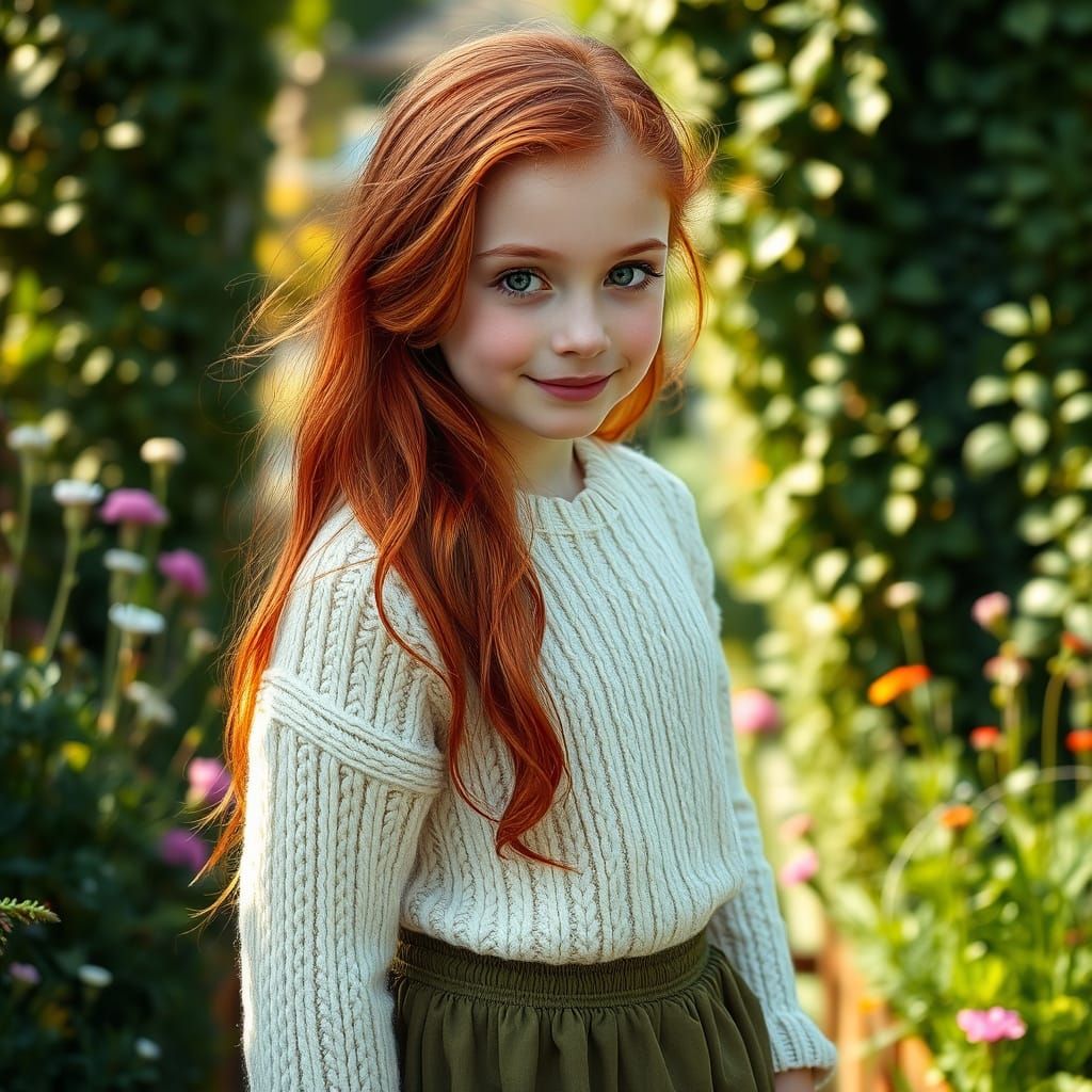 This image shows a vibrant young woman with fiery red hair and emerald green eyes, set amidst a lush garden filled with wildflowers and ivy, in a soft, dreamy light.