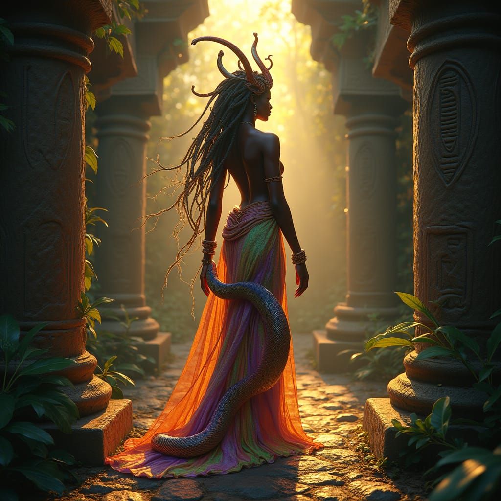 This image depicts a majestic scene of Ayida-Weddo, the Vodou Rainbow Serpent spirit, standing alongside Damballa, the Sky Father, in a mystical temple setting. The artwork combines elements of African and Haitian mythology, featuring a goddess with human-like upper body and serpent form lower body, surr...
