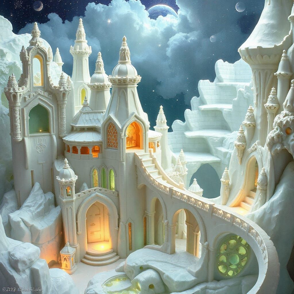 This enchanting watercolor illustration transports viewers to a mystical realm, where a fantastical jade castle stands amidst lush, organic curves and ancient zentangle carvings, with shimmering jade crystals and pearlescent details.