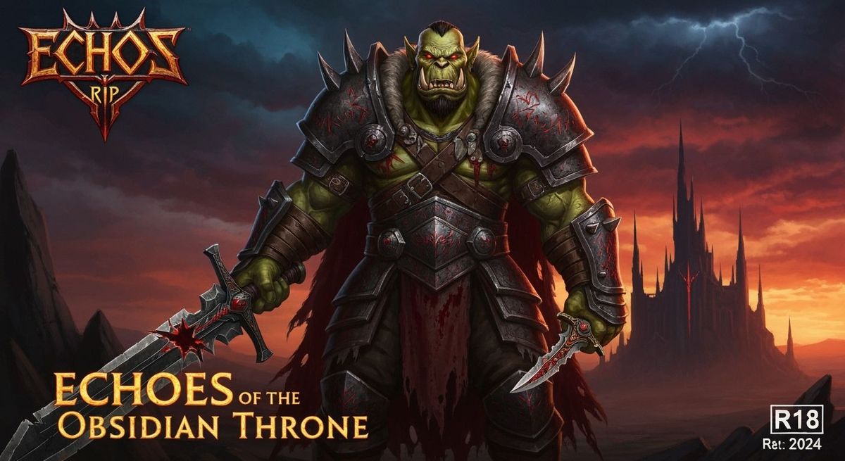 This image shows an Orc warrior standing before a crumbling citadel in a painterly style. The warrior is battle-scarred and holds a shattered obsidian great sword, rendered with crimson and orange lighting.