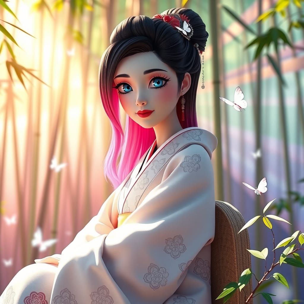 A striking picture of a geisha in a white kimono sitting in a bamboo garden. The digital art features pink and black hair, pale blue eyes, sunbeams, and white butterflies in a 3D render.
