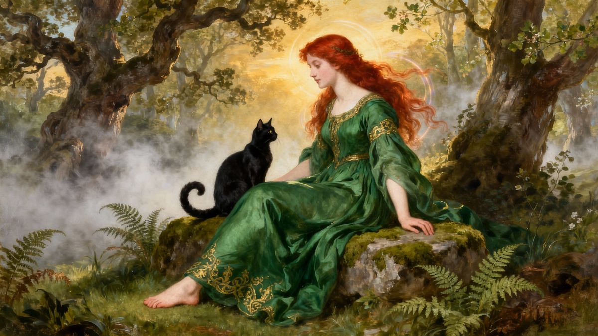 A beautiful young barefoot Celtic redhead woman with pale white skin sits on a stone in a clearing in a forest in Arthurian Britain. Foggy spring morning. Next to her is a cat sitting up. Style of Rubens.