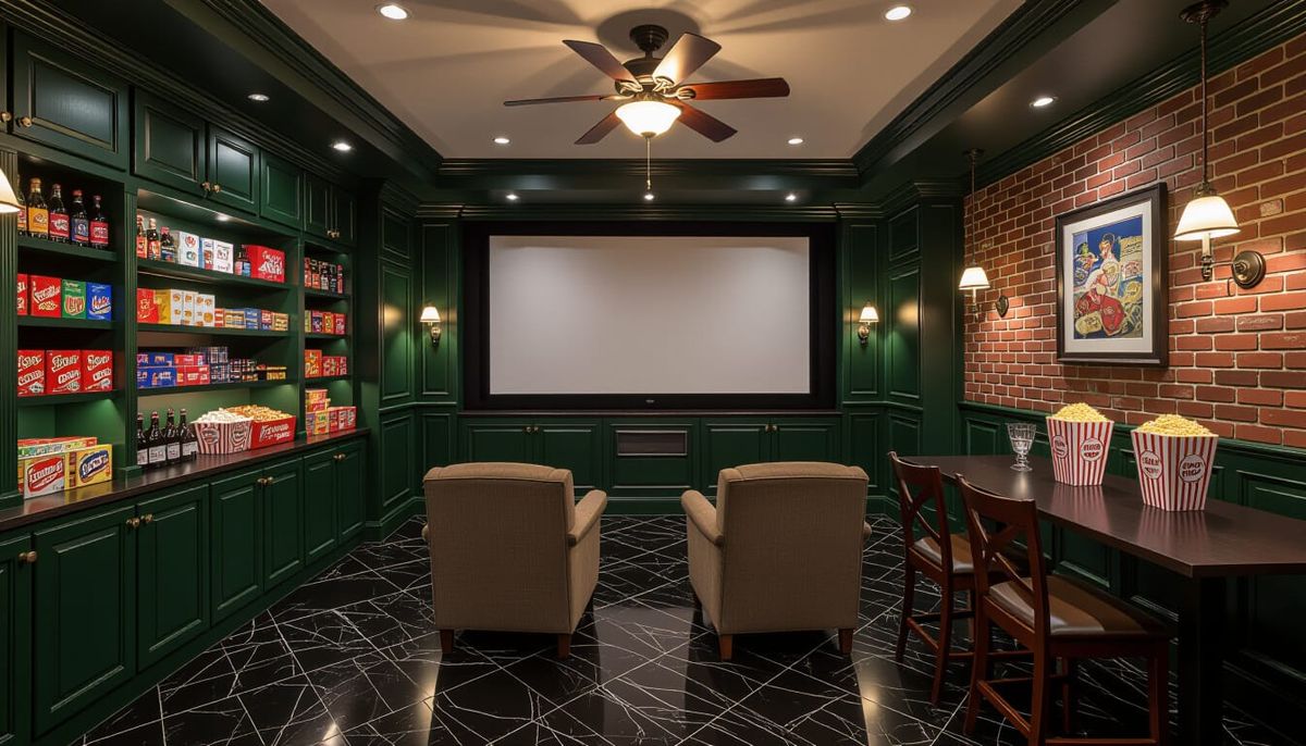 This image showcases a charming Victorian-style movie room with dark green walls and brick accents. It features a large screen, plush seating, and ambient lighting, creating a cinematic atmosphere.