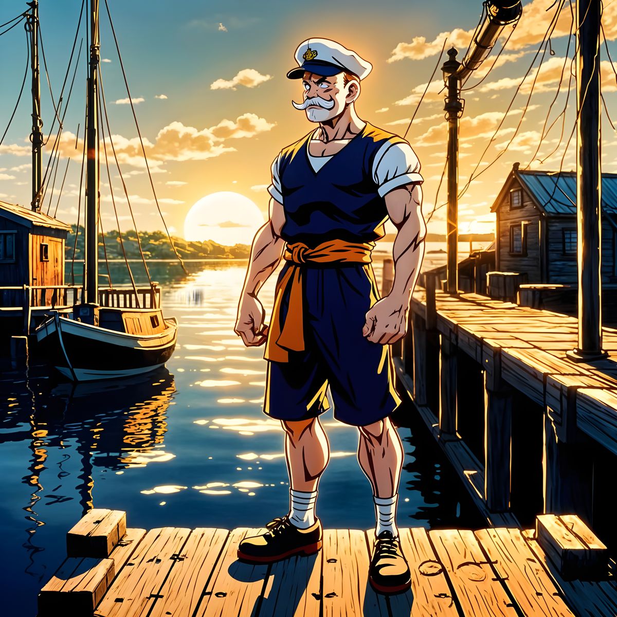 This image depicts Popeye the Sailor Man in a realistic anime style, blending classic cartoon charm with modern digital art techniques.
