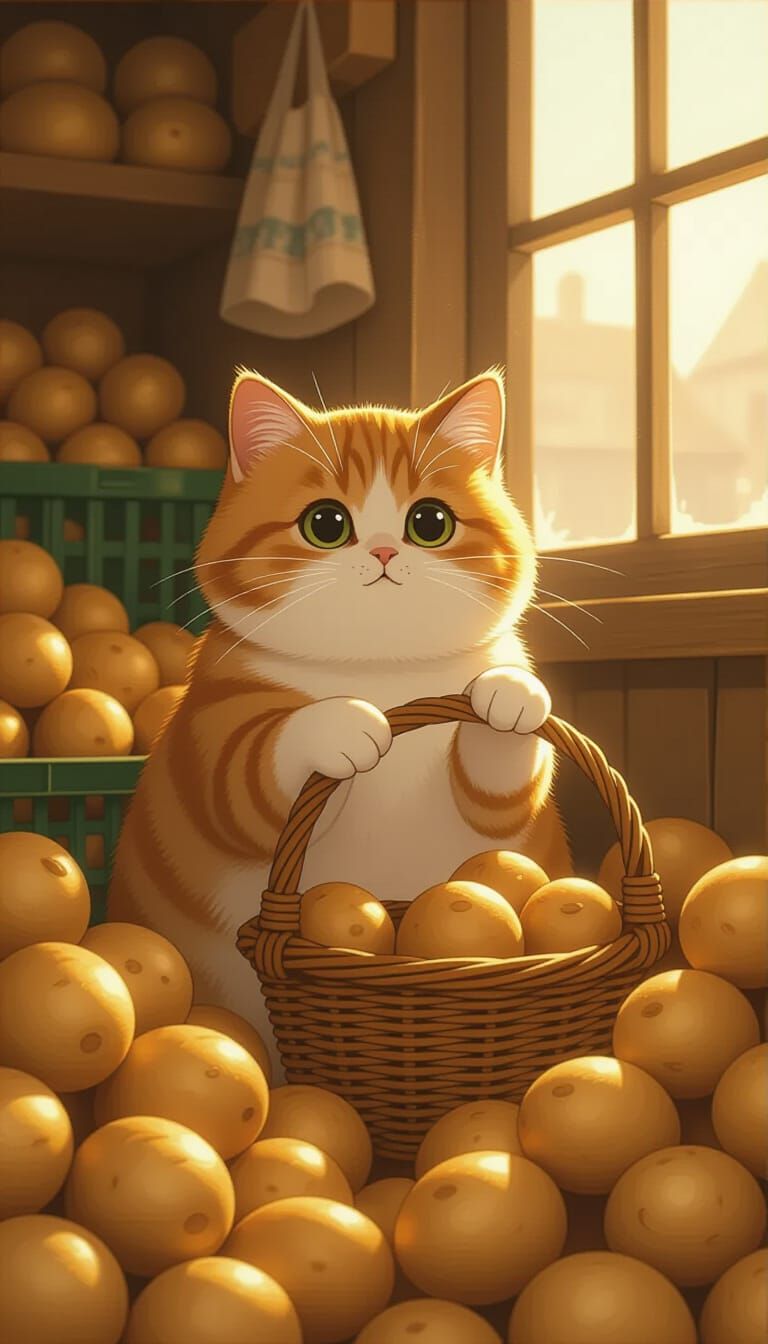 This charming illustration shows a plump orange and white cat carefully sorting potatoes into a wicker basket, bathed in warm golden light. Evokes a gentle, whimsical children's book feel.