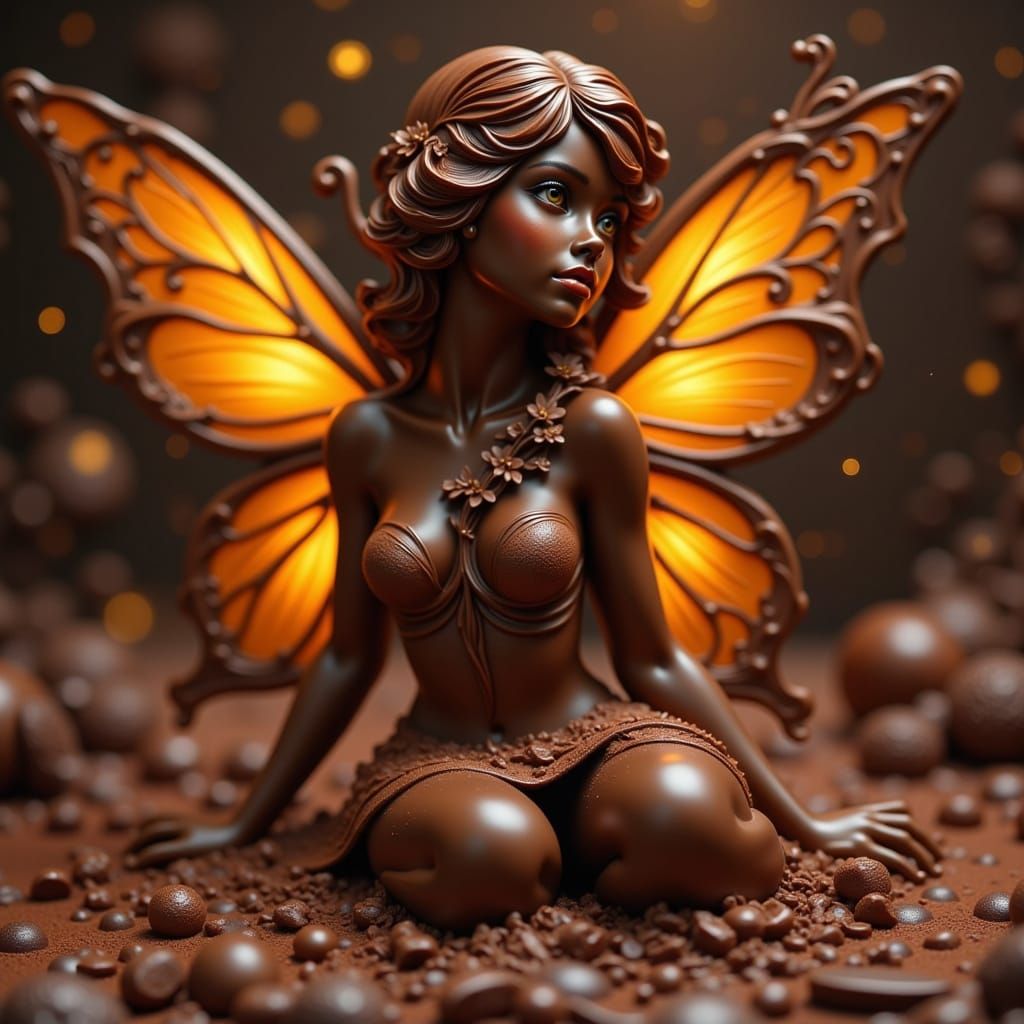 This hyperrealistic image depicts a magical faerie sculpted from dark chocolate, with cocoa-dusted wings. It radiates a warm caramel glow, showcasing intricate textures and a moody color palette.