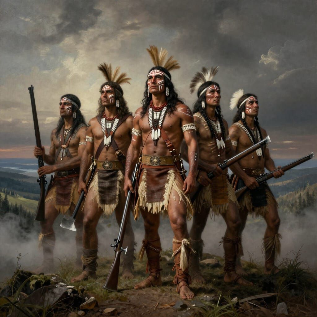This image shows five Irokesan Mohawk warriors in traditional attire, armed and painted, standing resolutely on a misty mountaintop. Dramatic lighting and a muted palette enhance the historical drama.