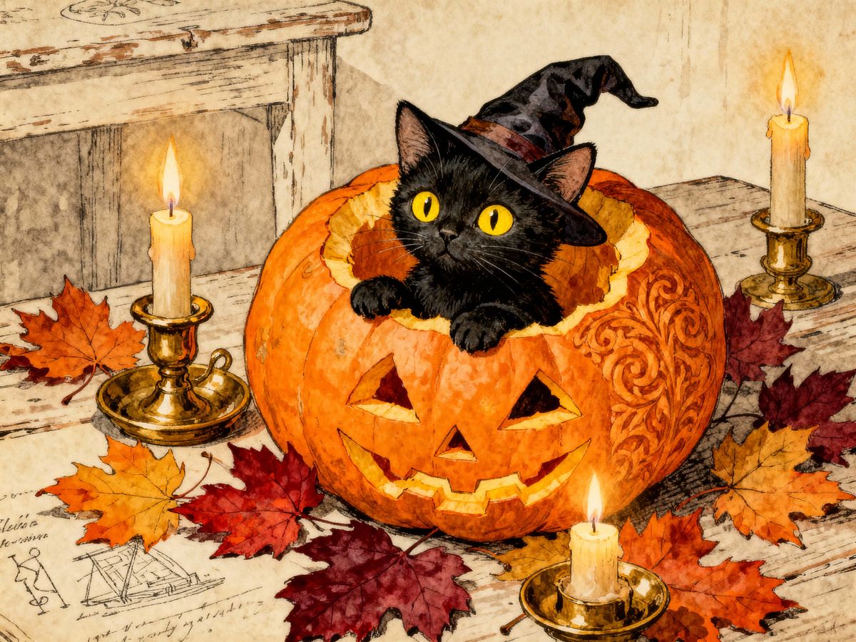 A black cat in a witch hat sits in a carved jack-o'-lantern with autumn leaves and candles. Rendered in a charming, vintage illustration style with bold lines and bright colors.