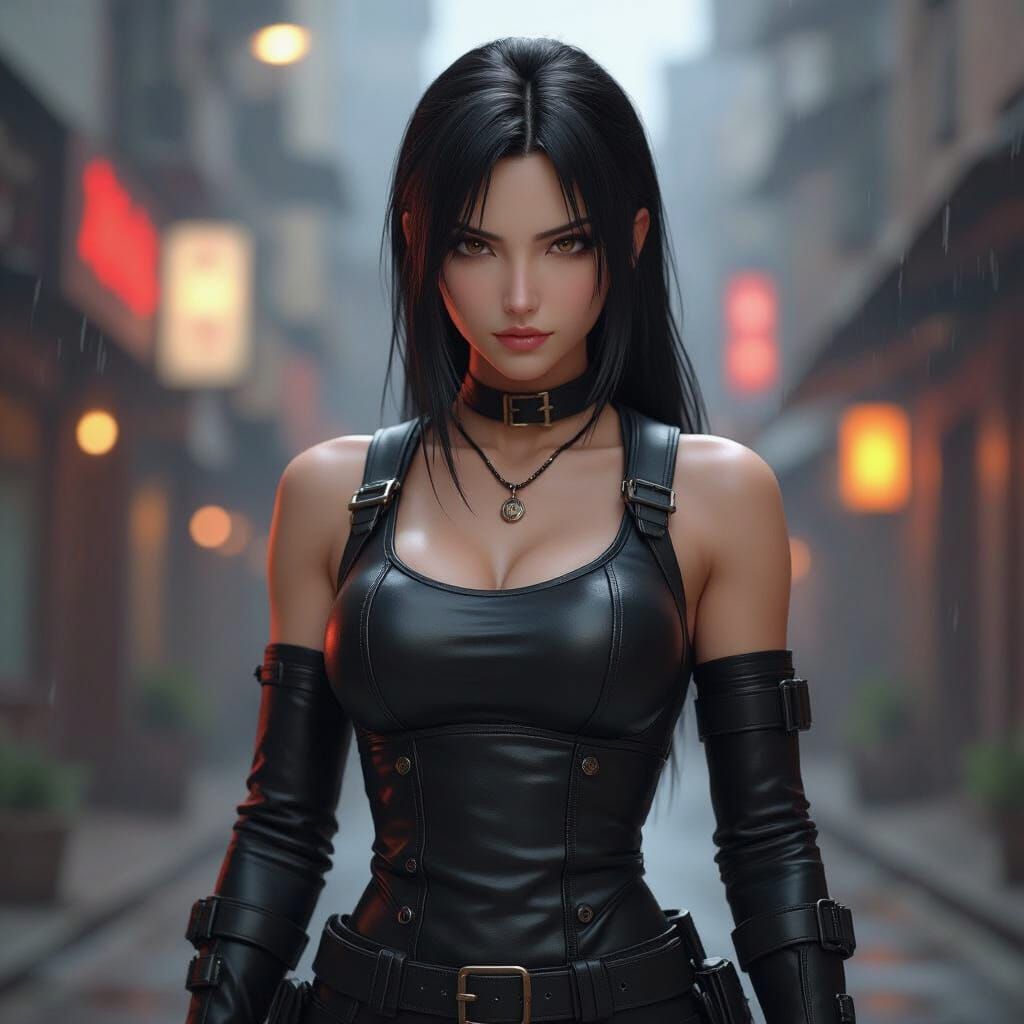 This image shows Tifa Lockhart in a black leather outfit, posed intensely against a dark urban setting. The artwork features 3D anime elements and hyper-realistic textures in a concept art aesthetic.