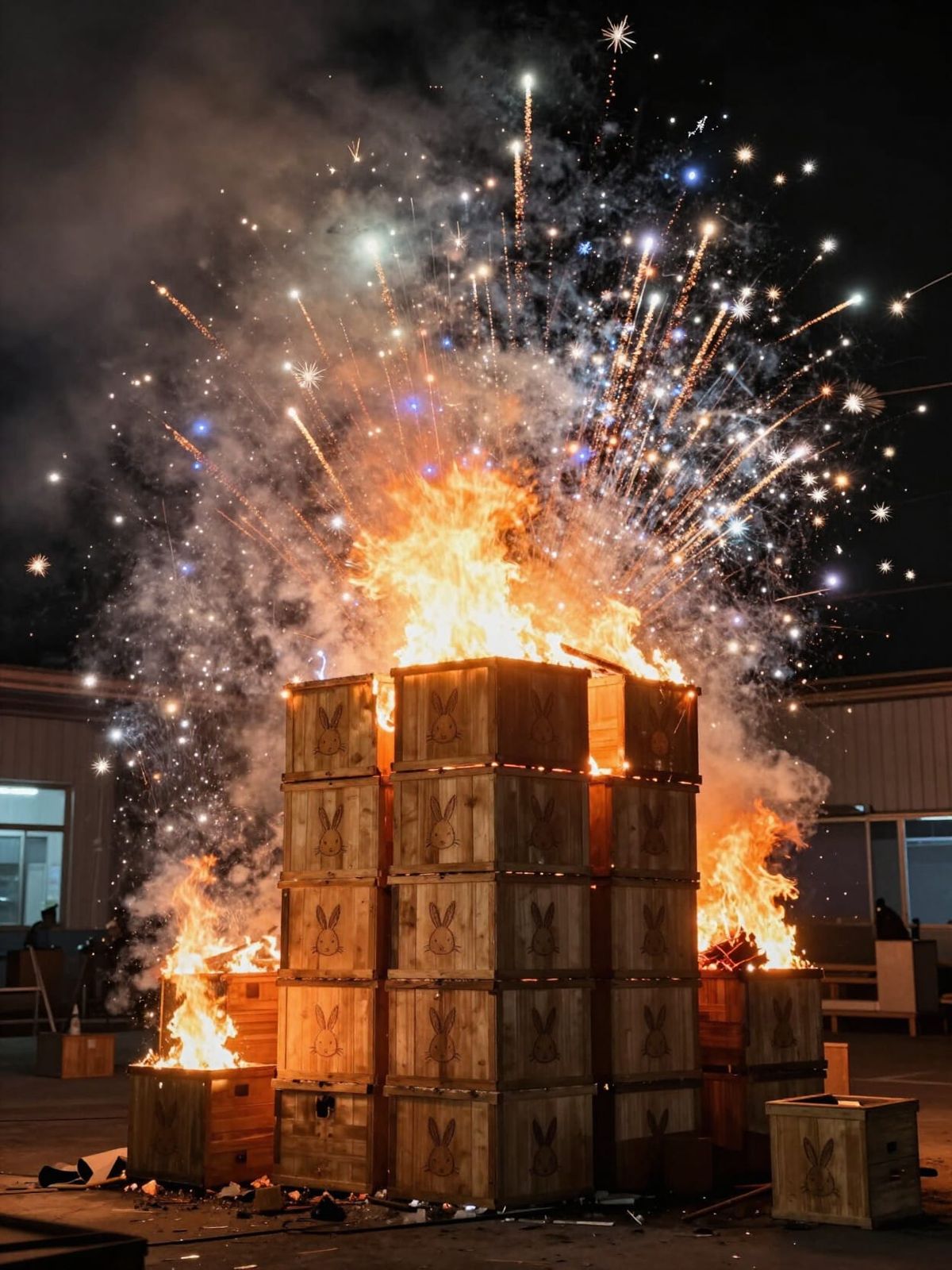 This image depicts a chaotic scene in a factory where a stack of wooden boxes, marked with a rabbit logo, has caught fire. Colorful fireworks erupt from the boxes in a dazzling, uncontrolled display.