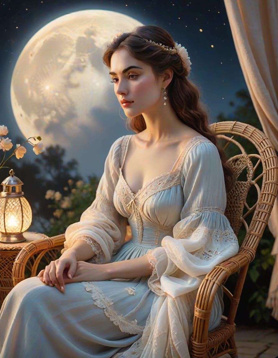 A beautiful impressionist portrait of a woman sitting in a wicker chair under a full moon. The artwork uses soft brushstrokes and gentle textures to create a dreamy, elegant atmosphere.
