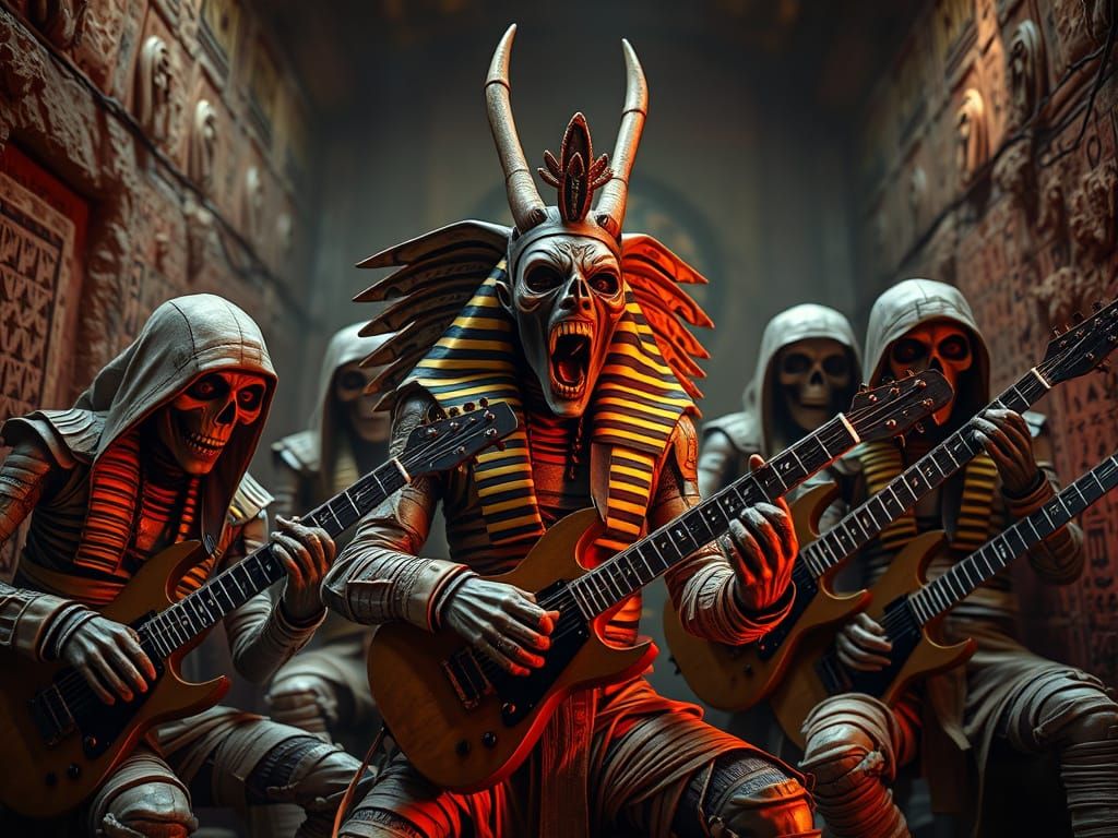 A striking picture of an Egyptian-themed heavy metal band performing in an ancient tomb. The band consists of Anubis and four mummies playing guitars in a horror aesthetic.