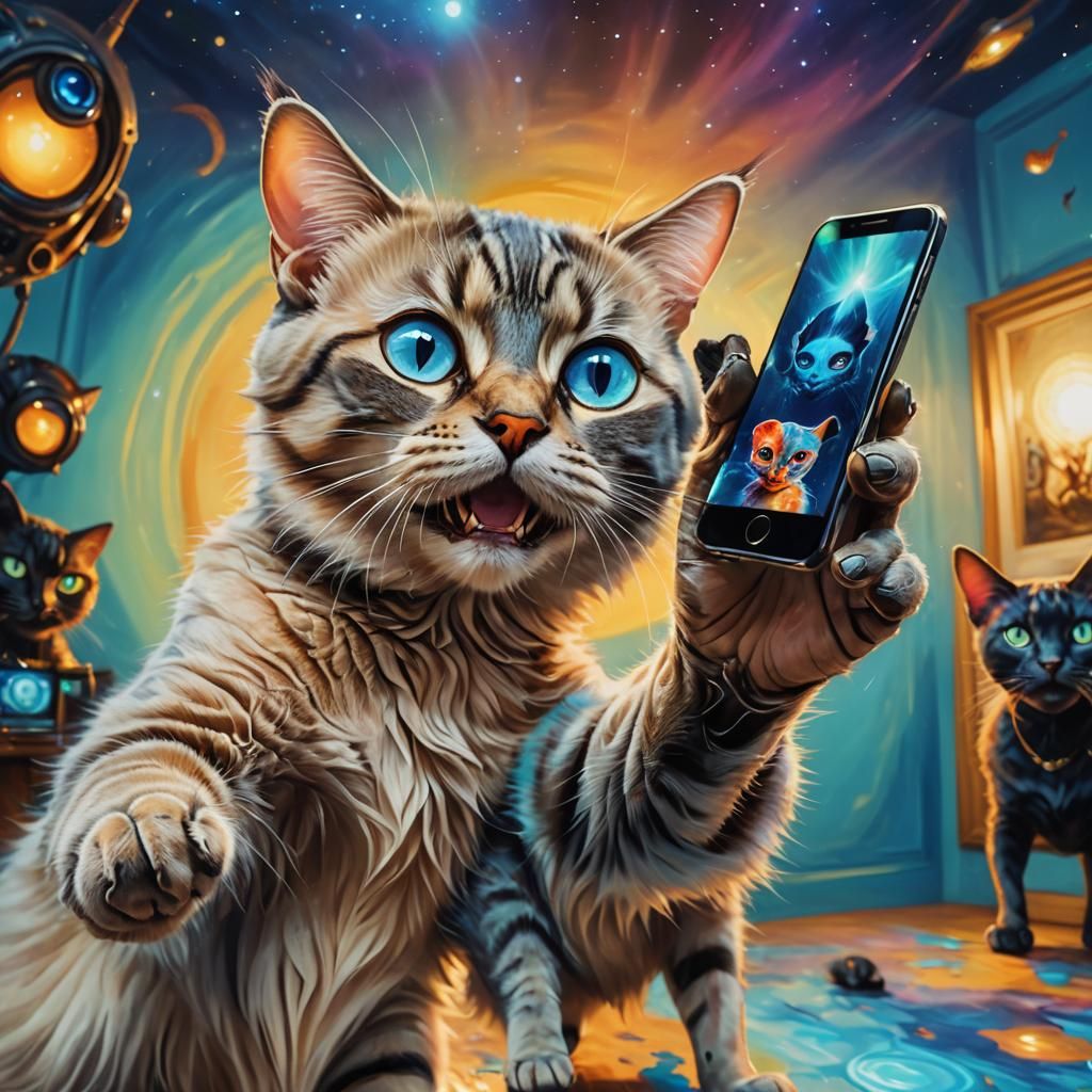 A vibrant oil painting showing a cat taking a selfie with a smartphone, with an alien in the background. The artwork features expressive brushstrokes, dreamlike qualities, and surreal elements with glowing blue eyes.