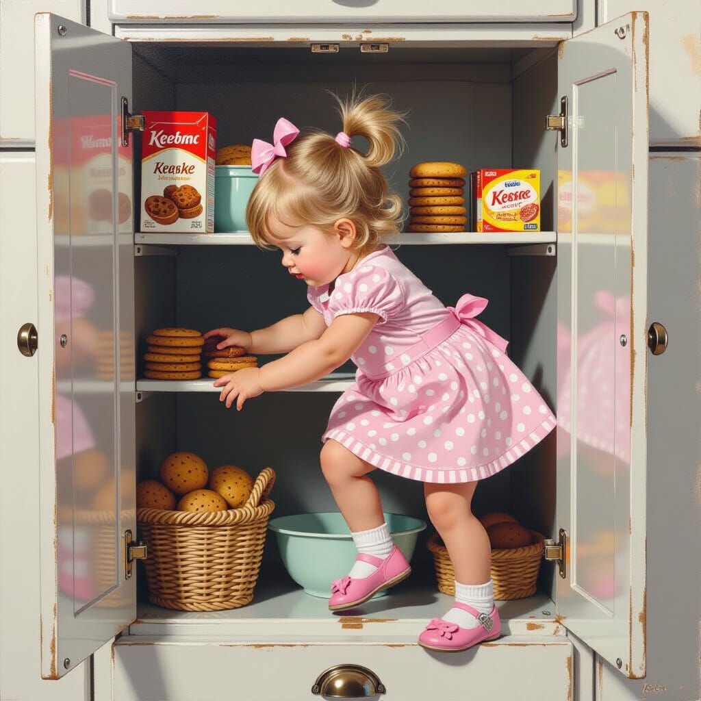 This image shows a little girl with pigtails and a pink dress climbing a loaded kitchen cabinet to get chocolate, while a pack of cookies falls on her head. The drawing is hyperdetailed in a charcoal art style.