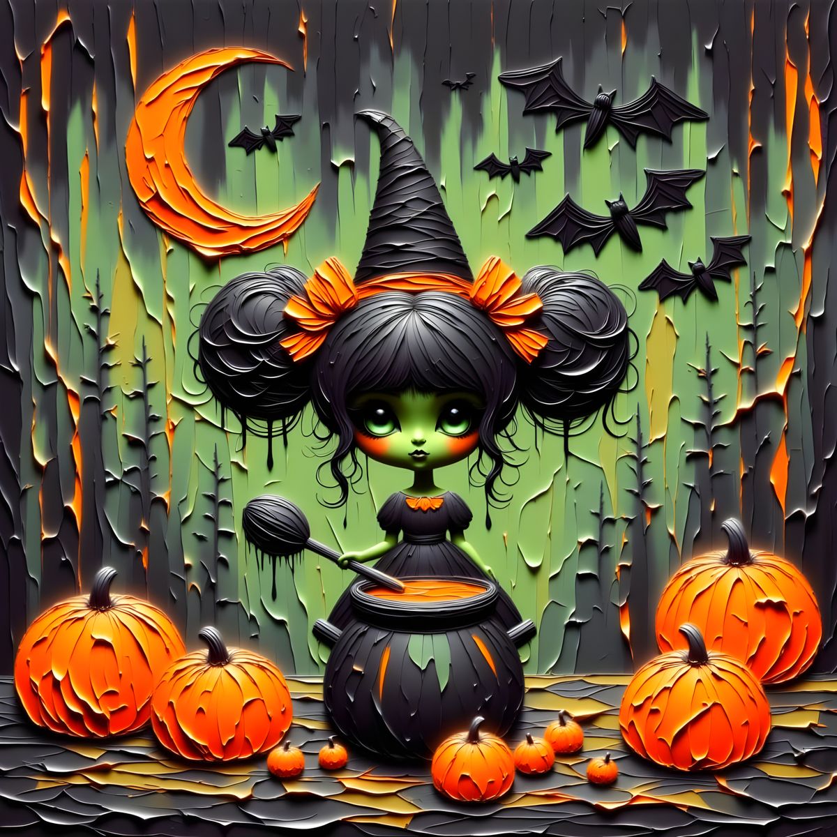 A charming image of a chibi witch with green skin brewing a potion in an enchanted forest. Bats fly around her in a vibrant, fantastical scene with Halloween colors, reminiscent of anime art.