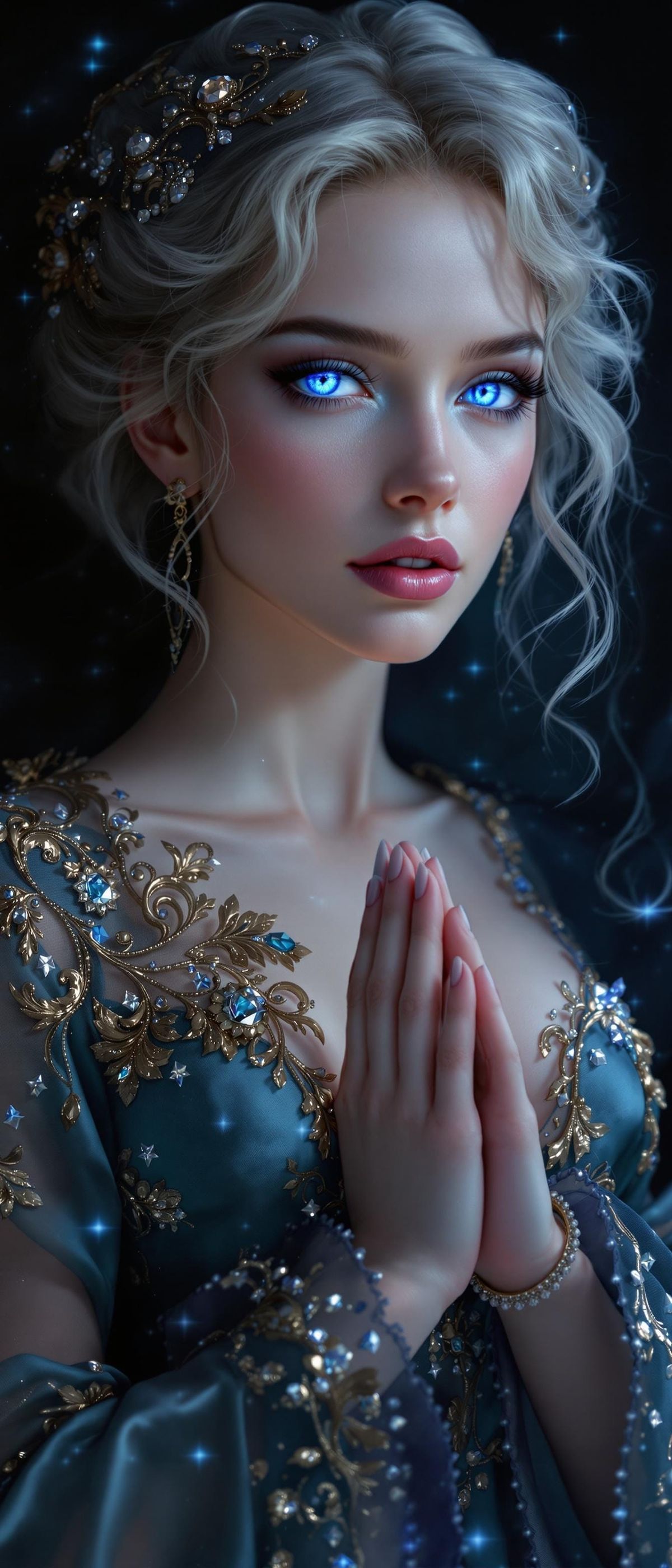A portrait of a mystical woman in a flowing silk gown, set against a dark background, with shimmering sapphire eyes and intricate lace details, showcasing hyper-detailed concept art with dynamic lighting and triadic colors.