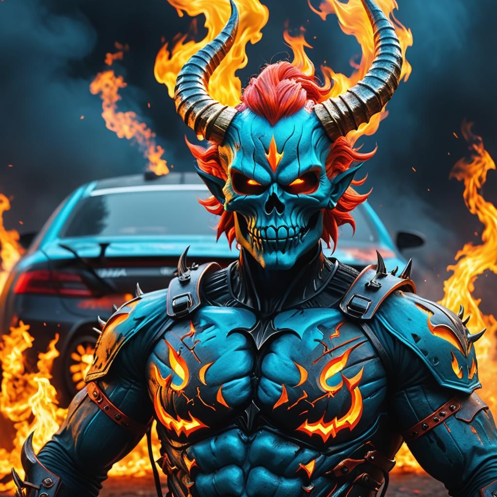 Magical hellish man with 2 horns and 2 spikes behind his back in flames halloween flammen pumpkin Red blue black automobile 1