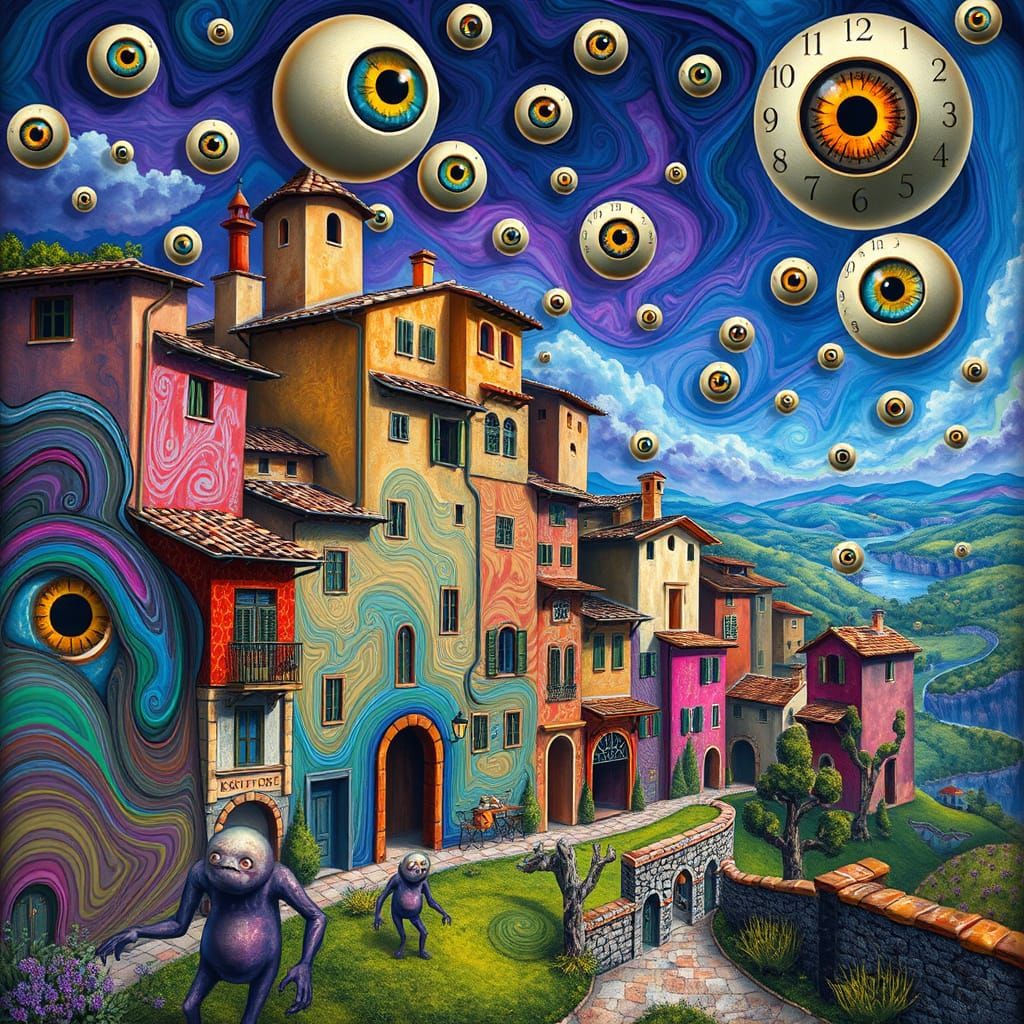 This surreal image depicts a fantastical village where buildings twist and writhe like living entities, surrounded by strange creatures and a kaleidoscope of floating eyeballs in a psychedelic dreamscape.