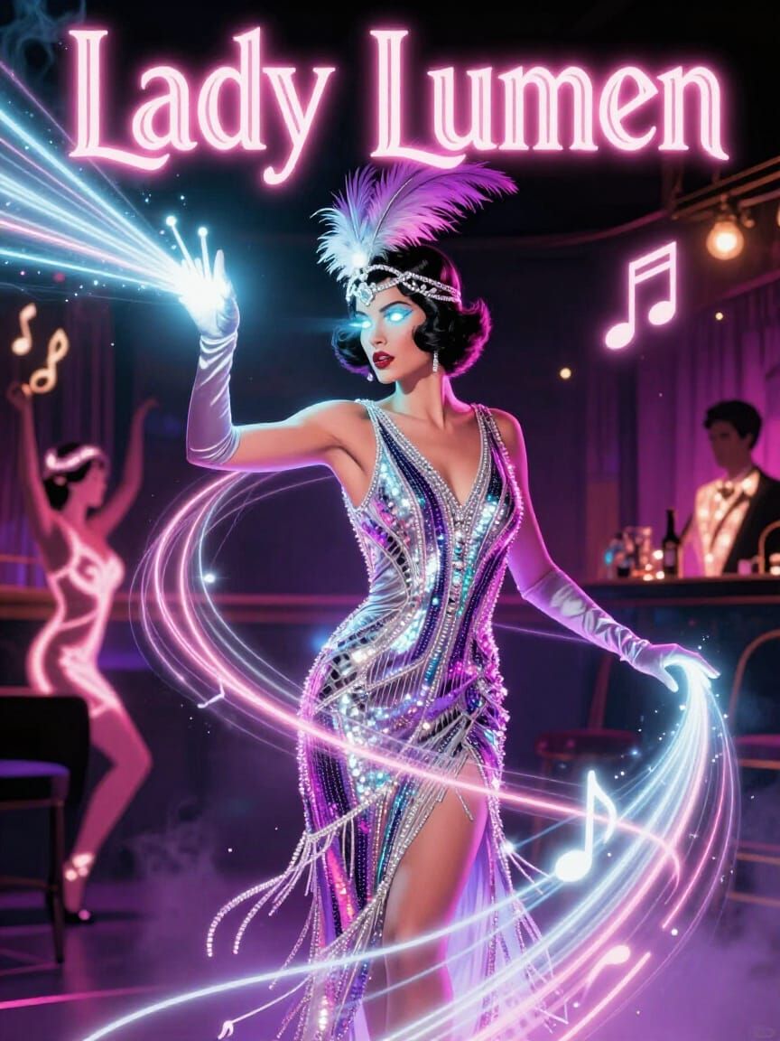 This image shows Lady Lumen, the Light Weaver, performing in a smoky jazz club. She wears a sequined flapper gown and her fingers trail light beams. Rendered in a vibrant, Art Deco style with glowing elements.