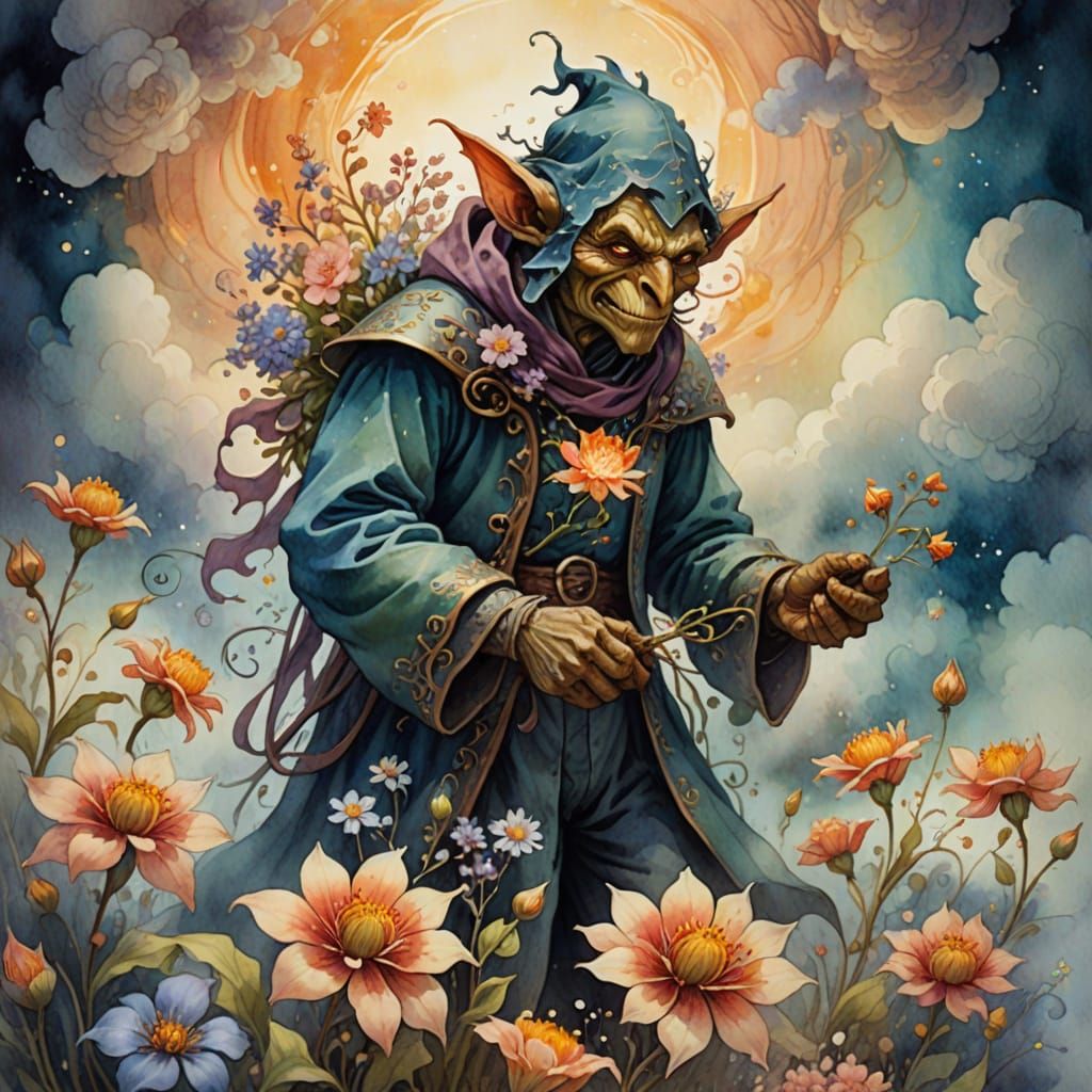 This image shows a hobgoblin tending to a vibrant garden filled with glowing, otherworldly flowers. The artwork is rendered as an antique watercolor, featuring soft, ethereal light and swirling clouds in pastel colors.