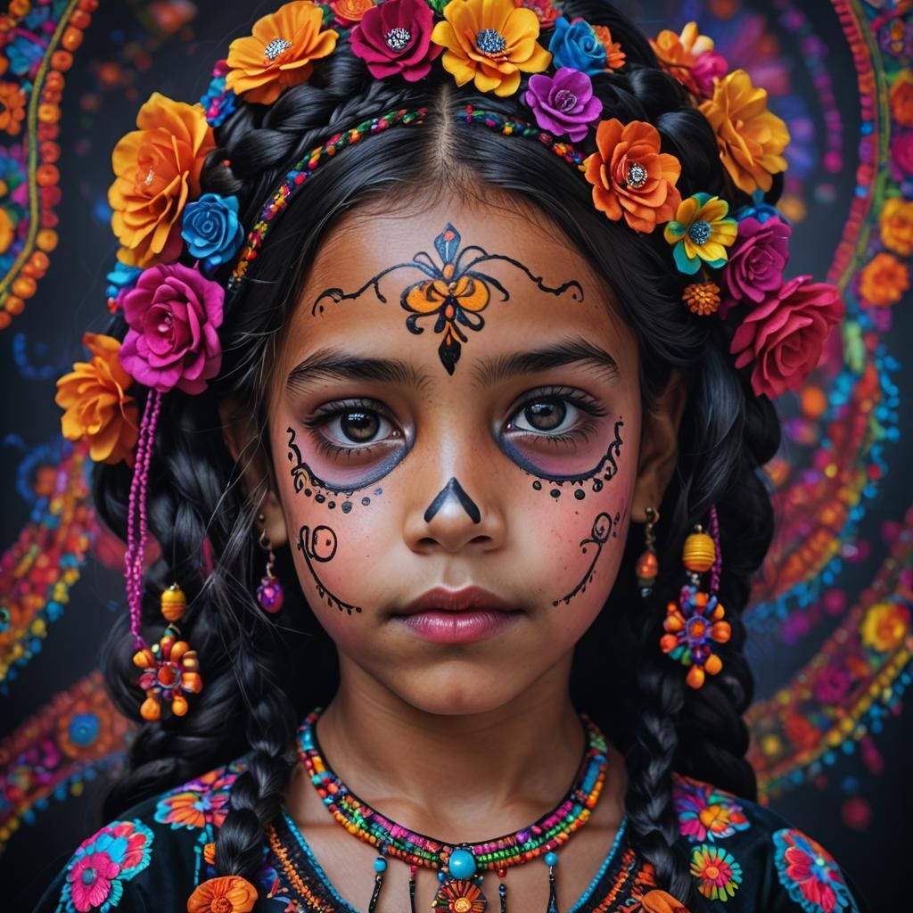 A striking portrait of a 6-year-old Colombian girl dressed as a Catrina. The hyperrealistic photograph, reminiscent of Mexican folk art, features vibrant colors, a softbox light, and a bokeh effect.