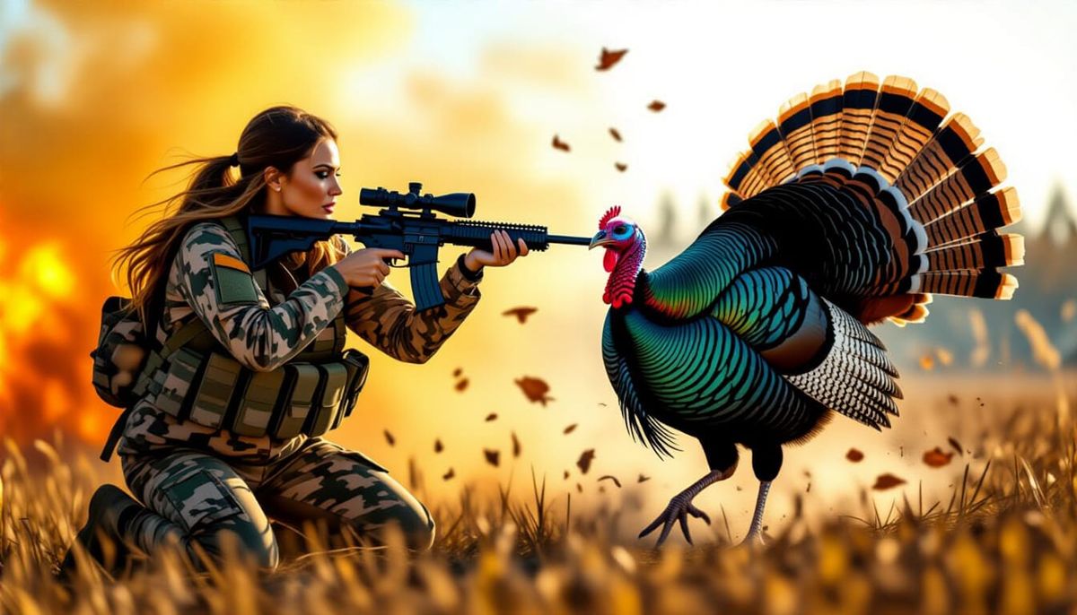 This hyperrealistic photo shows a woman in camouflage hunting gear pursuing a turkey on a chaotic battlefield. The vibrant background suggests a Thanksgiving conflict. Captured with sharp focus and natural lighting.