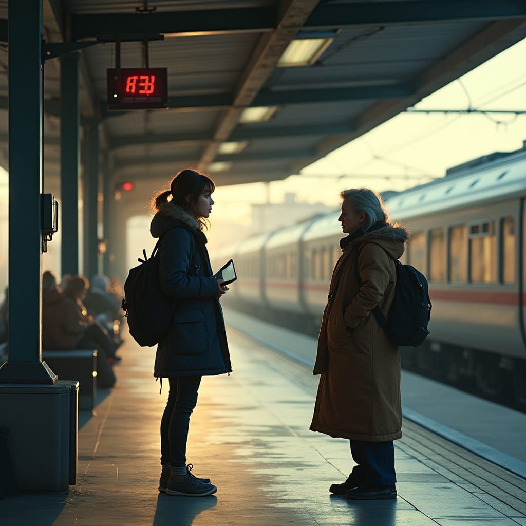 This image shows a French girl talking to a tired woman at a German train station. The scene blends photorealistic elements with fantasy, featuring complementary colors and soft lighting.