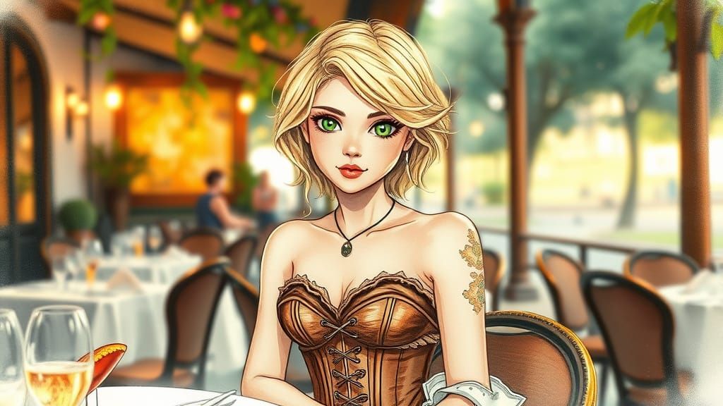 A young blonde woman with green eyes, depicted in a whimsical ink and watercolor style, sits at an outdoor Parisian cafe. Golden hour light creates an ethereal, misty atmosphere.