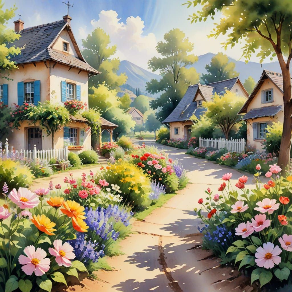 This image shows a serene watercolor village scene with lush greenery, blooming flowers, and warm sunlight. Delicate brushstrokes and gentle colors create a peaceful atmosphere.