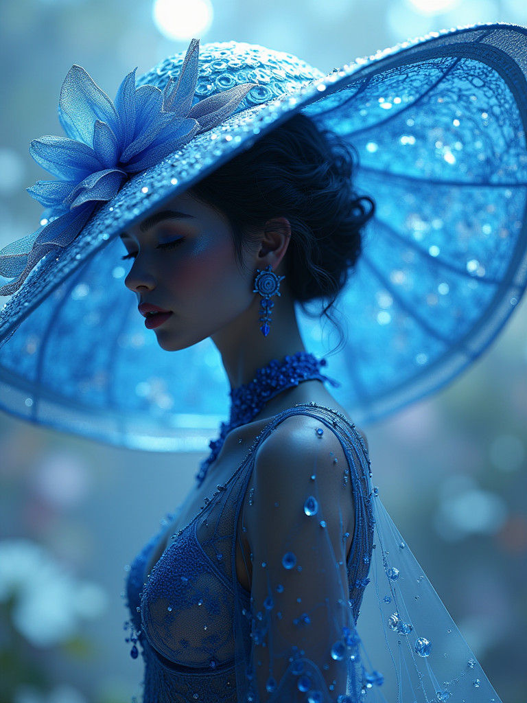 ECU ryot grrl intricately diaphanous wearing an enormous hat brightlygilt lacywing symphonicblues by artist "moody colourina" silverlapis larimar sapphire contours by artist "GrifFX" silver lining speech waveform blueberry whirl background by photographer "kinda blue ripples" ZBrush Octane Render Unreal ...
