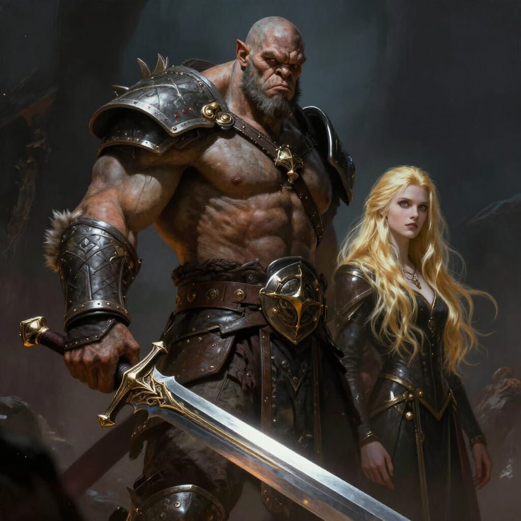 This image depicts a powerful Orc warrior with a large sword, protectively shielding a young man with long blonde hair. Features dramatic, cinematic lighting and an epic fantasy concept art style.