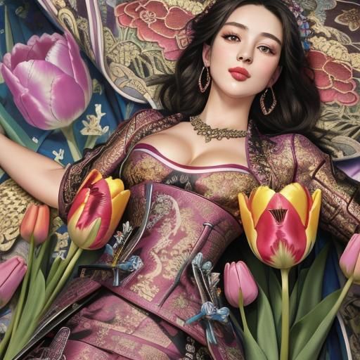 Lady, Full Figure, 100 colors, (masterpiece brocade :1.5), tulips, hyperrealism oil on canvas maximalism maximalism color corrected split-complementary colors color gradient
