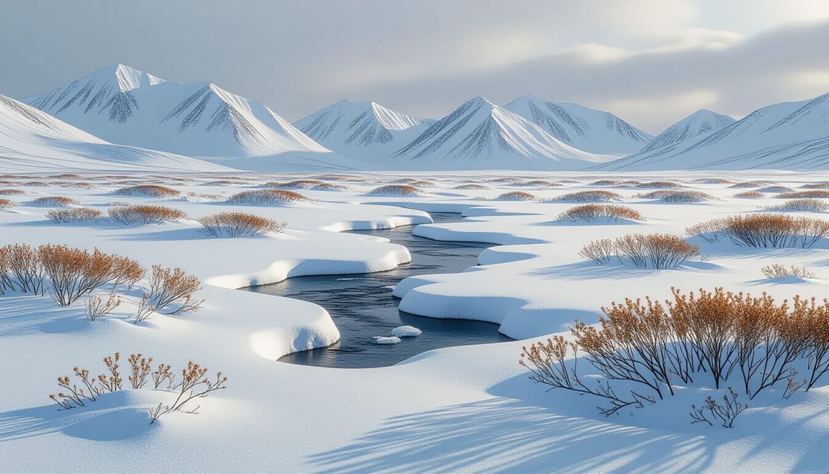 A hyper-detailed artwork depicting the Arctic Tundra with snow-covered ground and brown foliage. Features frozen waterways, distant snowy peaks, and a cloudy gray sky, rendered with deep neon colors and clean lines.