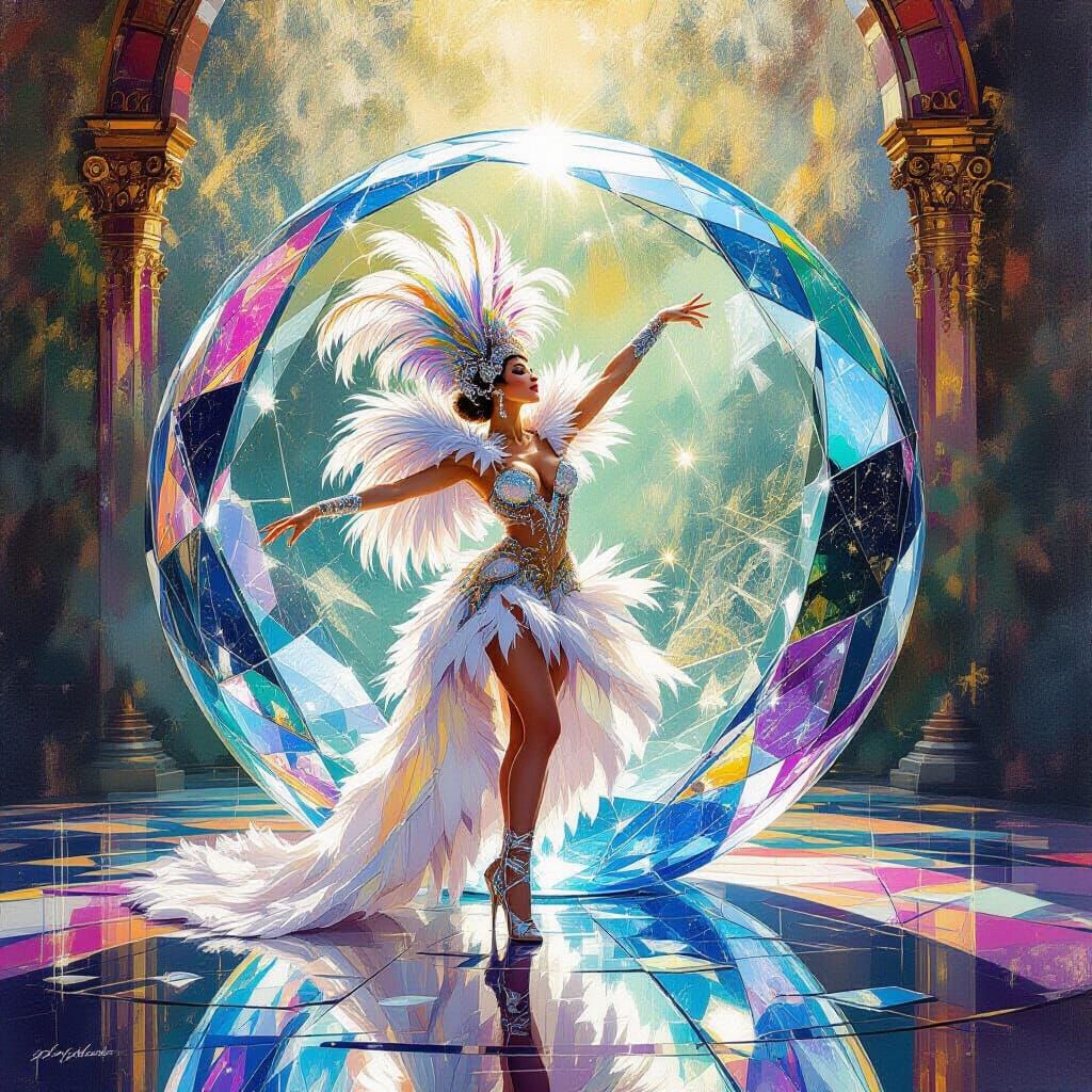 A dazzling cabaret dancer in a feathered costume on a stage. The scene is a vibrant, maximalist gouache style with impasto brush strokes, resembling impressionist paintings with watercolor undertones.