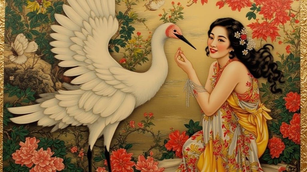 This hyperrealistic image captures a beautiful Asian woman and a crane in a moment of connection, featuring alcohol ink textures and gold leaf details for a dramatic effect.