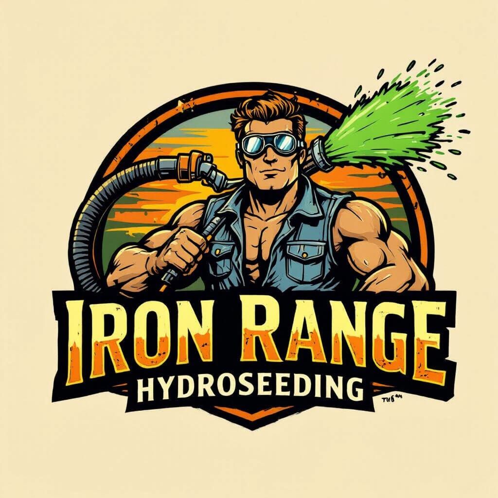 This image showcases a vintage hot rod style logo for Iron Range Hydroseeding, featuring a mechanic spraying vibrant green hydromulch. The design evokes speed and power with a retro automotive feel and warm lighting.