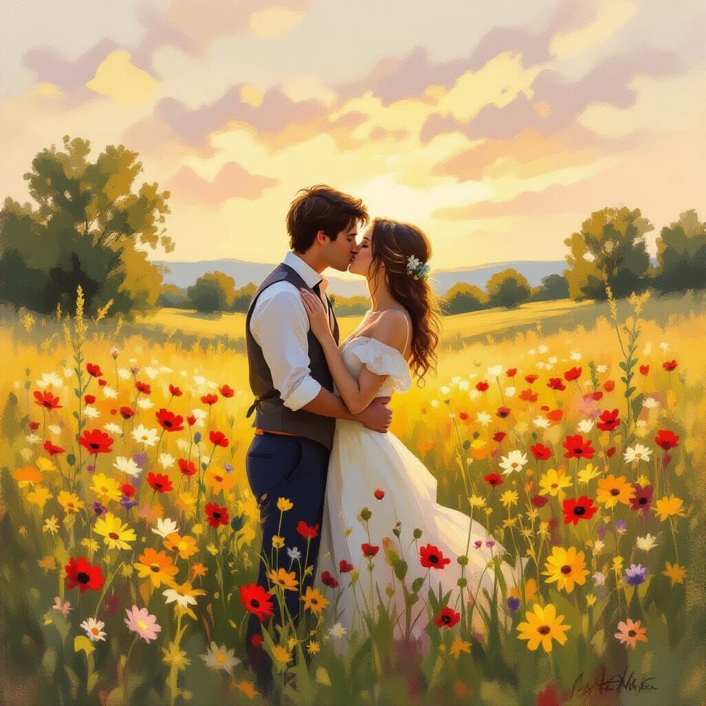 This image captures a tender first kiss between a young couple in a meadow at golden hour. Rendered as a romantic oil painting with visible brushstrokes and luminous colors.