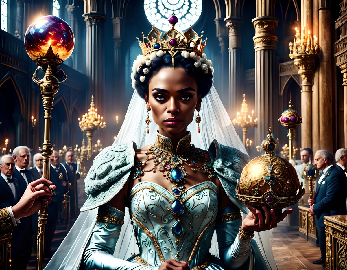 This image features a bored young queen holding a sceptre and orb, adorned in a gorgeous, intricate wedding dress. It's a maximalist digital matte painting with dramatic, atmospheric detail.