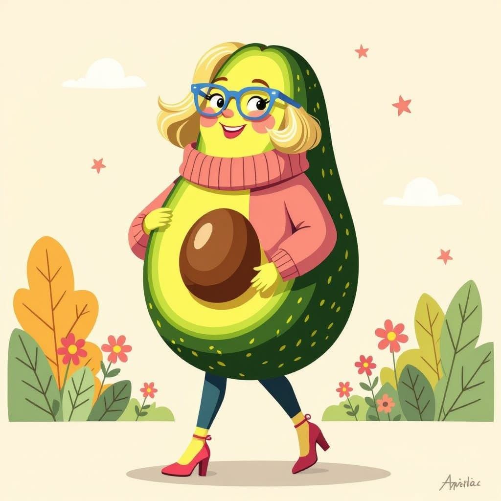 A ripe avocado with blonde hair, blue glasses, and a pink coat stands tall in a charming Mid-Century illustration style. This friendly character wears high heels and is depicted with soft lighting.
