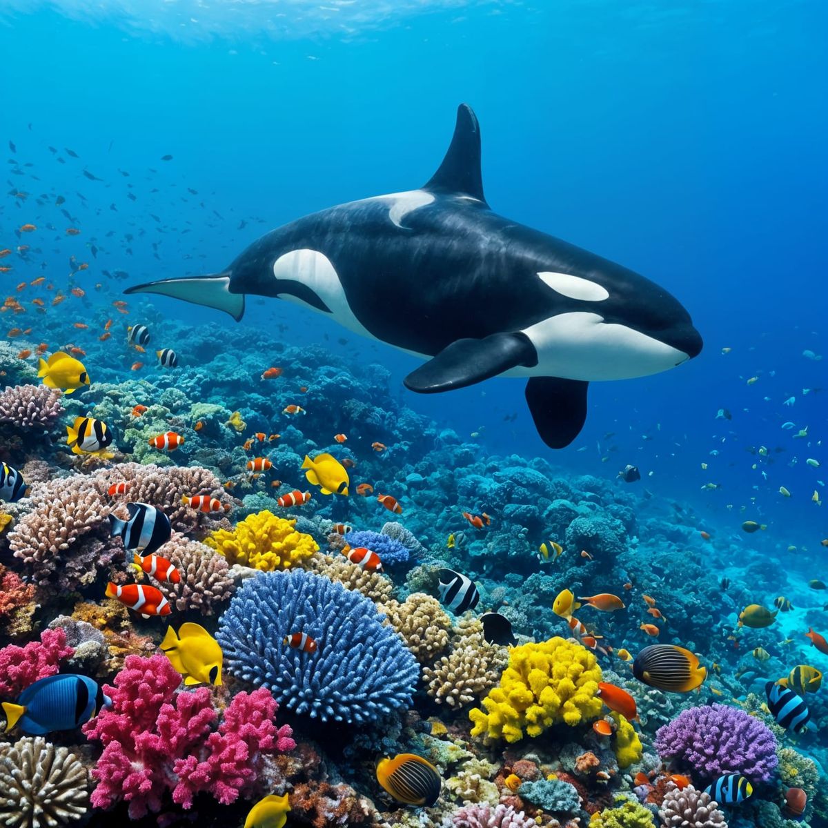 A photorealistic image of an orca swimming near a coral reef. The vibrant colors and balanced composition create a cinematic and highly detailed scene.