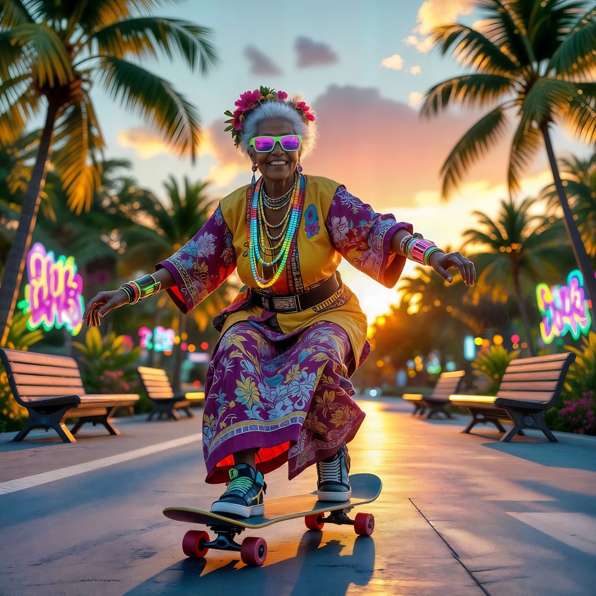 For the "Never Too Old For...": A vibrant digital artwork of an native Surinamese elderly woman with neon-lit cybernetic enhancements joyfully skateboarding through a tropical solarpunk park in a futuristic Paramaribo.