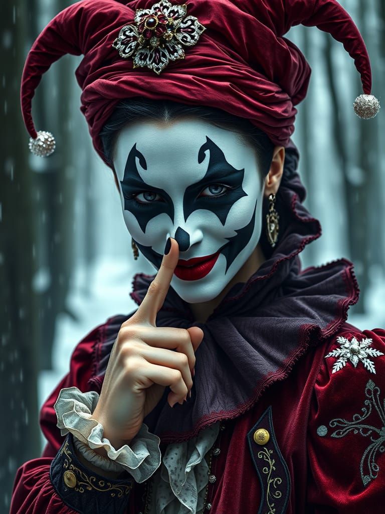 This image shows a harlequin woman in a Victorian-era velvet gown, her face painted with a sinister smile. She gestures for silence against a snowy forest backdrop, rendered with hyperrealistic textures and a cinematic atmosphere.