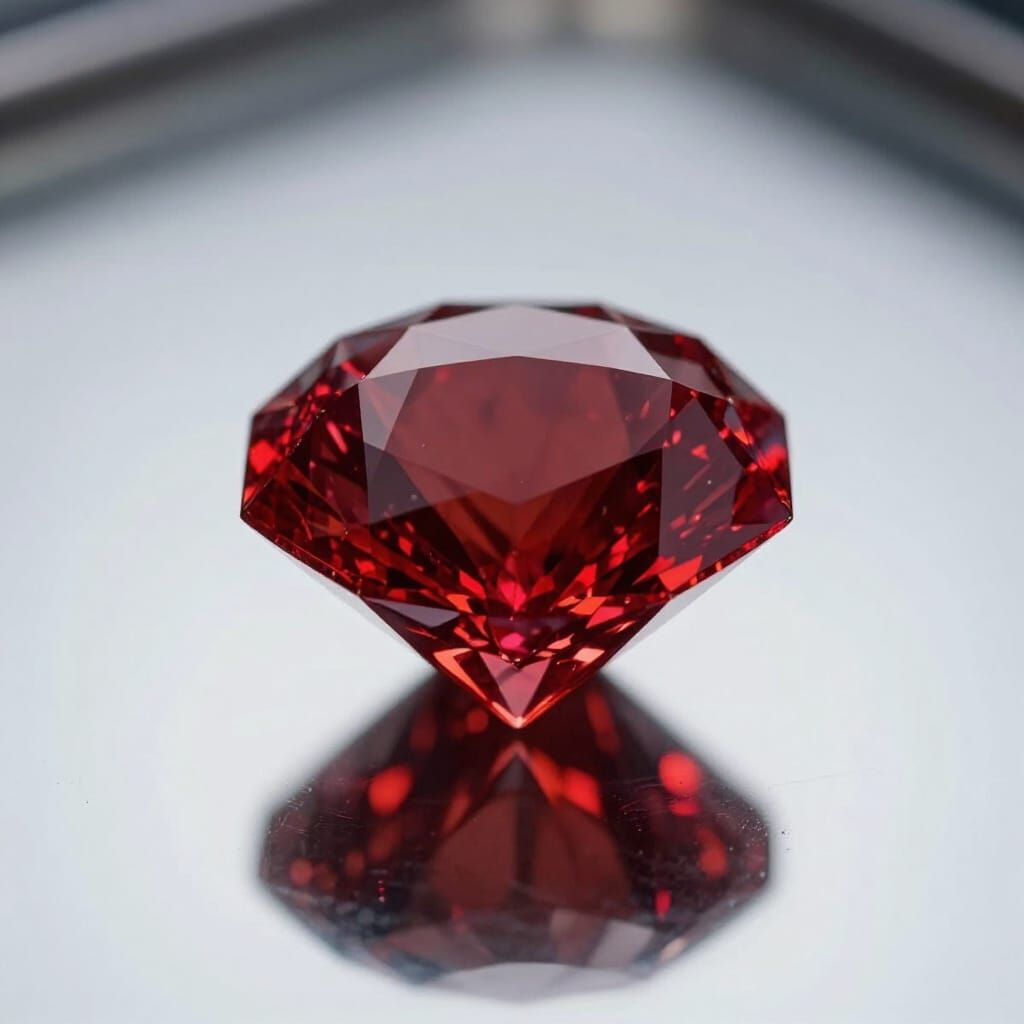 This image showcases a vibrant red diamond resting on a reflective mirrored surface, creating a sense of depth and luxury. The composition highlights the gem's facets and the distorted reflections.