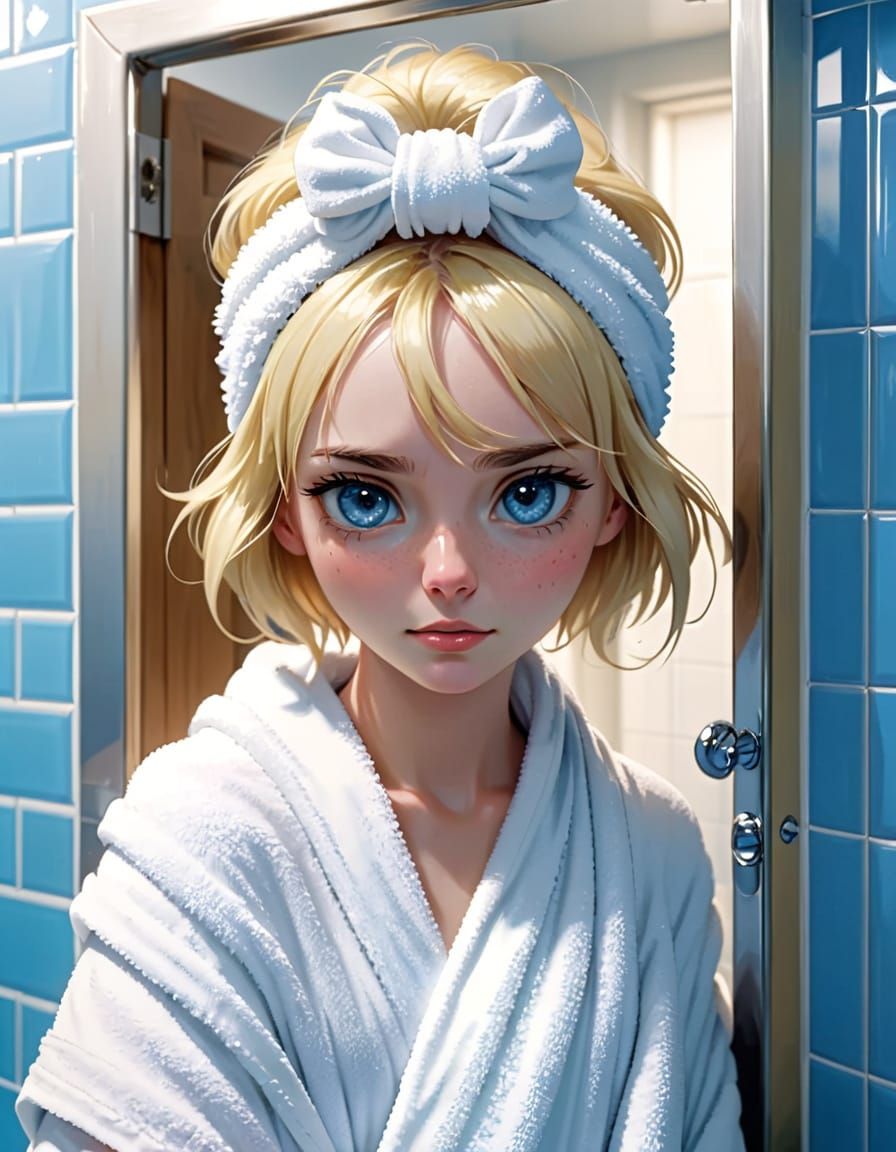 This image shows a young woman in a bathroom setting, depicted in a 3D style with a focus on her expressive features and fair skin. She's wrapped in a towel and adorned with a white headband and blonde hair.
