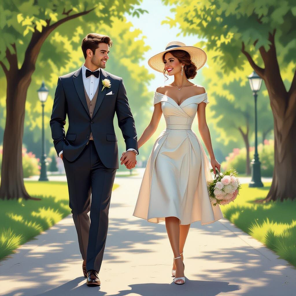 This image shows a young, beautiful housewife in an elegant dress and hat walking in a park with her husband, holding hands, on a sunny summer evening. The artwork is hyperrealistic with vibrant colors.