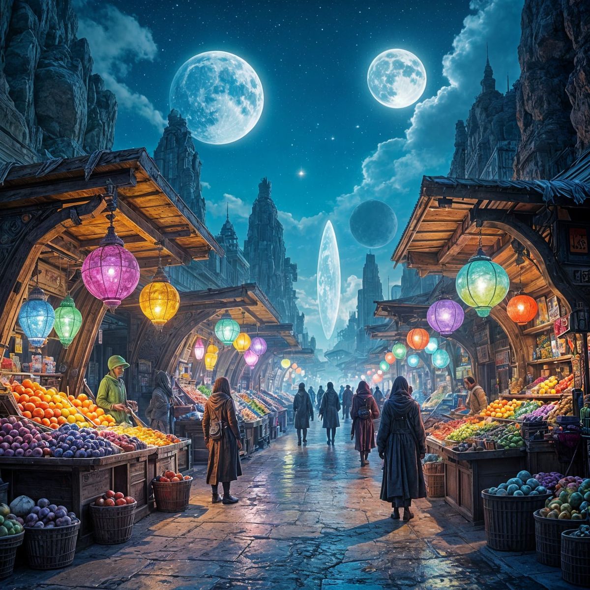 This image shows a vibrant alien marketplace under a double-mooned sky. Extraterrestrial vendors offer glowing fruits and strange artifacts from crystalline stalls in this fantasy concept art.