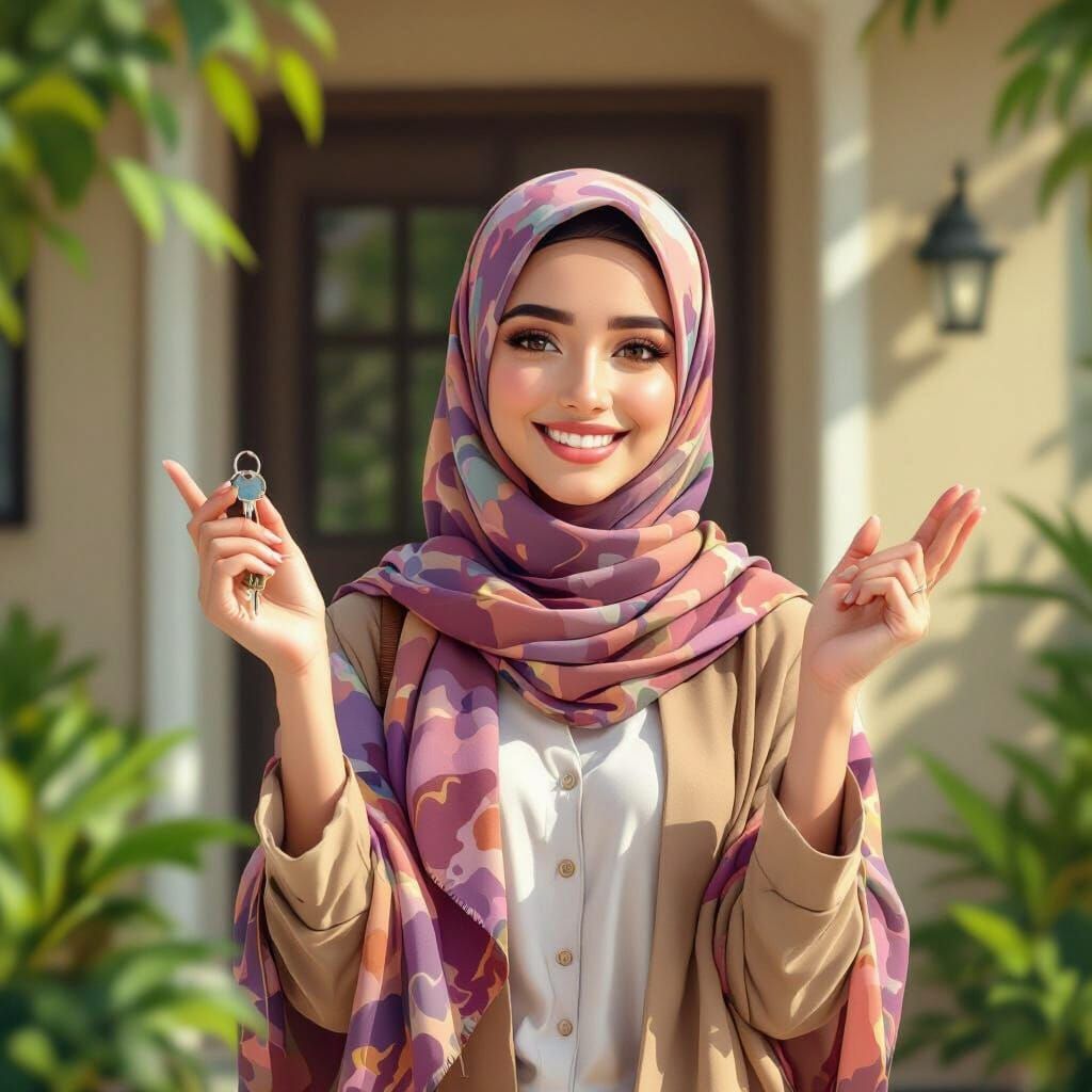 This image shows a jubilant young woman in a colorful hijab outside her new house. The picture, rendered with realistic and whimsical touches, captures her joy and success in a bright, sunlit setting.