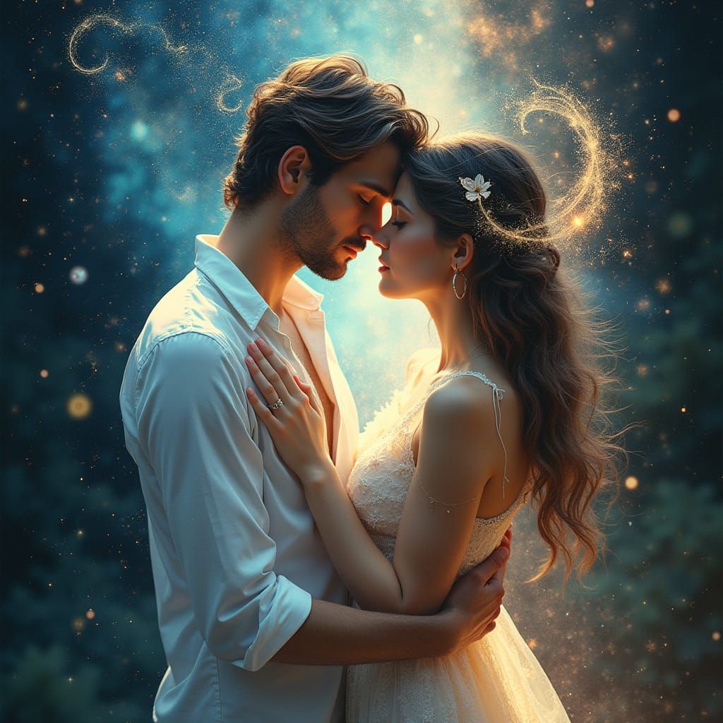 This image depicts a tender, ethereal scene of a loving couple in a 5th dimensional realm, surrounded by swirling patterns of iridescent energy and shimmering colors, evoking harmony, balance, and cosmic unity.