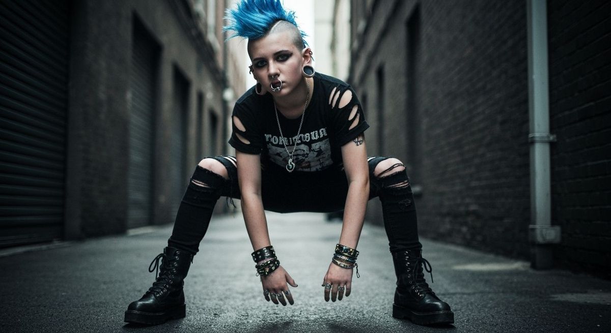 A striking picture of a punk rocker with vibrant blue hair and multiple piercings. The subject is posed in an urban alleyway, showcasing a rebellious and energetic style. The image evokes a dark and moody atmosphere.