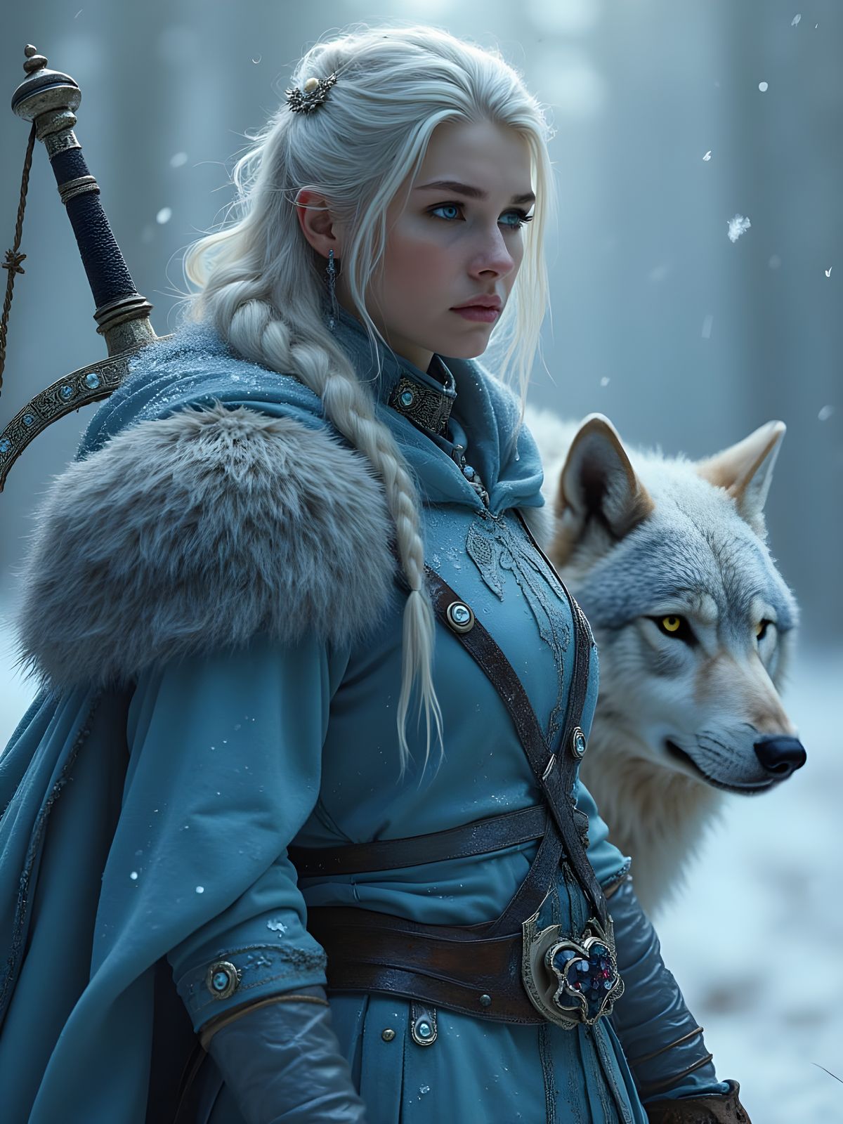 This image shows an ice-armored warrior woman with a shimmering sword, accompanied by a wolf. The digital artwork features vibrant colors and intricate details.